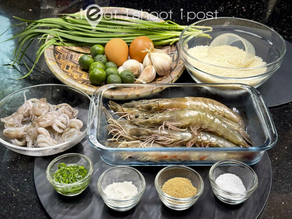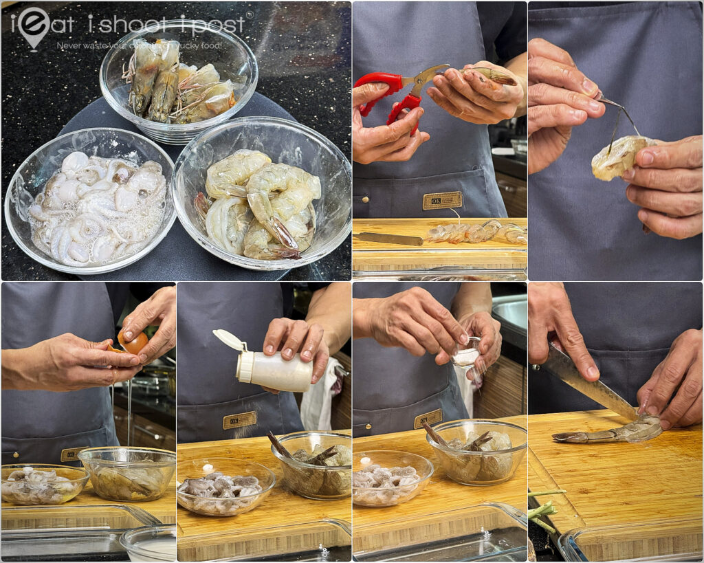 - Marinate prawns and baby octopus with salt, white pepper, egg white, and corn starch.