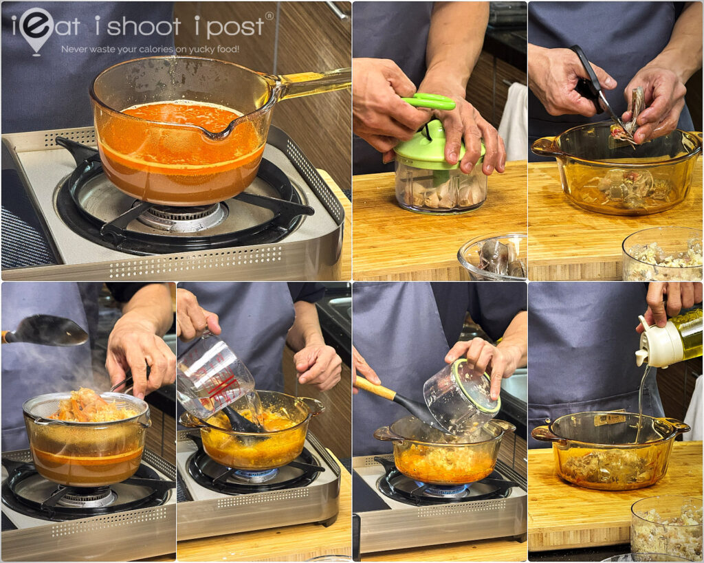 - Add marinated prawns and baby octopus into the stock while it is still hot.