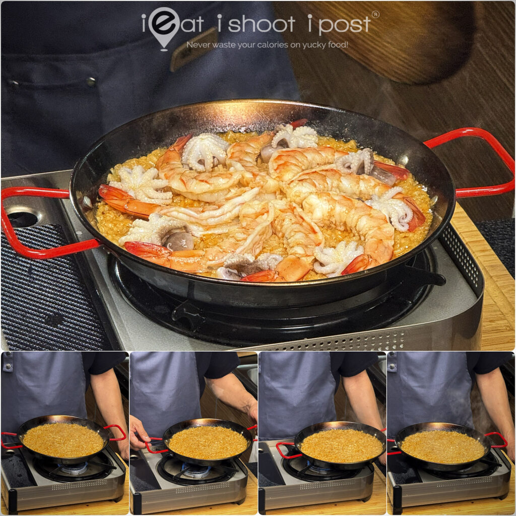 - Add prawns and octopus to the paella in the last 3 minutes and cover the pan.