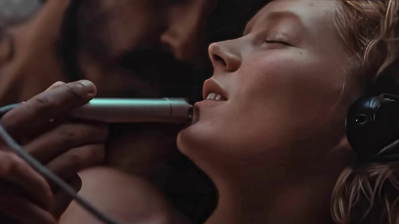 “With your eyes you enter the world; with your ears the world enters you,” murmurs stymied electronic music composer Daphne Davenport (Rosy McEwen) in Bryn Chainey’s folk horror film Rabbit Trap. It could be a manifesto for this weird film as a whole—even for cinema as such in 2025. Rarely has sound seemed so sensual, so fleshly. We watch Davenport’s partner, Darcy (Dev Patel), slowly caressing his wife’s body with a Sennheiser shotgun microphone. Her skin thrums like rushing water; the hairs in her armpits sound like the ground crumbling away beneath your feet. Throughout the film, sound is related to touch, coarse and grainy, intimate and always close. The electronic score by Lucrecia Dalt is equally carnal—simultaneously viscous and friable, brittle and slippery. You can hear the physical action of Dalt’s hands manipulating tape as it flows through reel-to-reel machines, her voice encrusted with layers of analog effects.