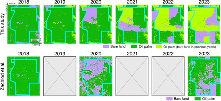 Land-cover classifications compared. The original study (bottom) misidentified bare land (purple) as lost to palm oil production, while our reanalysis (top) shows this as replanting (light green) and continued palm oil production.