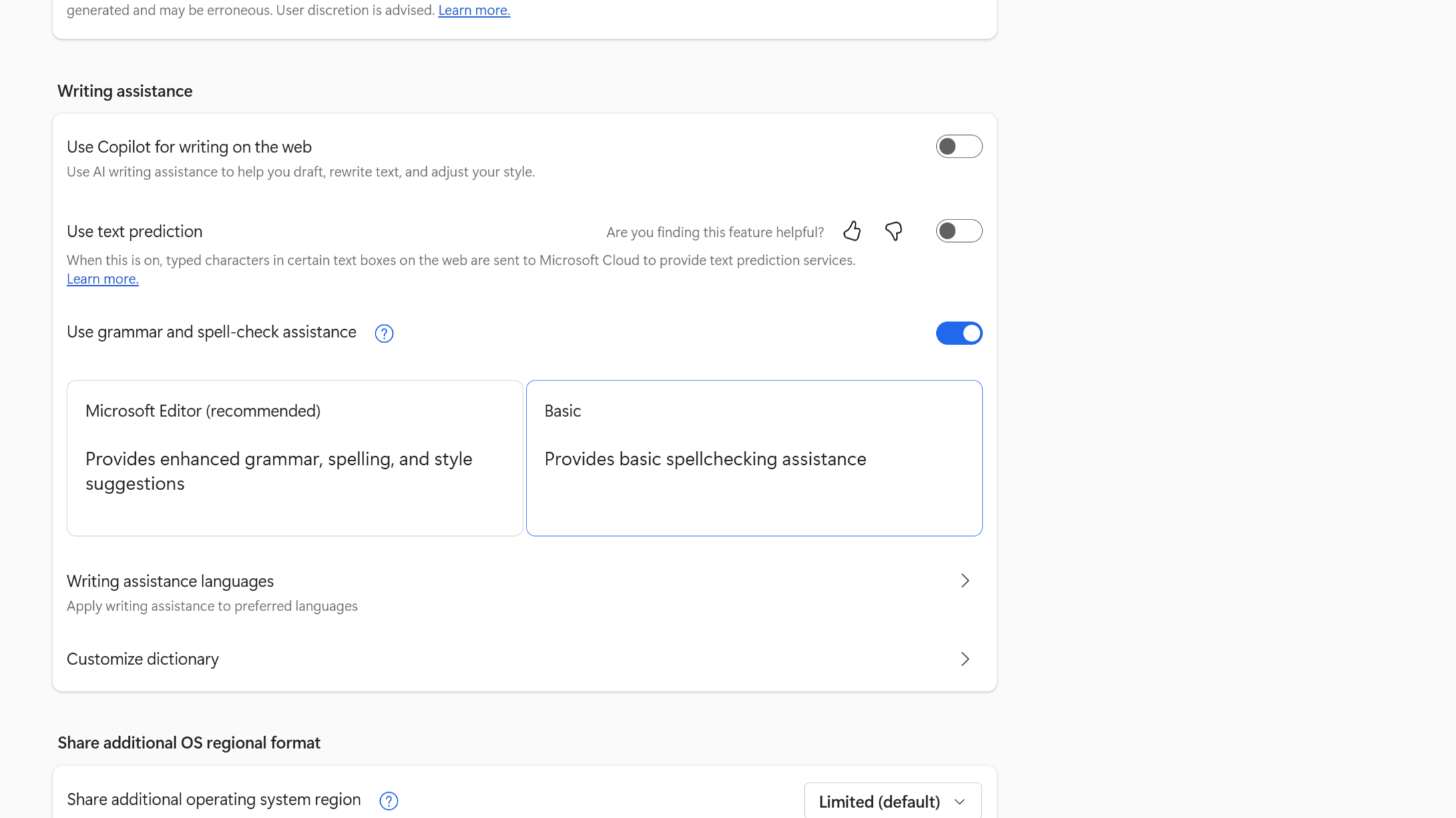 Click Languages in the left-hand navigation. Disable “Use Copilot for writing on the web.” Turn off “use text prediction” if you want to prevent things you type from being sent to Microsoft, and switch the spellchecker from Microsoft Editor to Basic. (I don’t actually mind Microsoft Editor, but it’s worth remembering if you’re trying to minimize the amount of data Edge sends back to the company.)