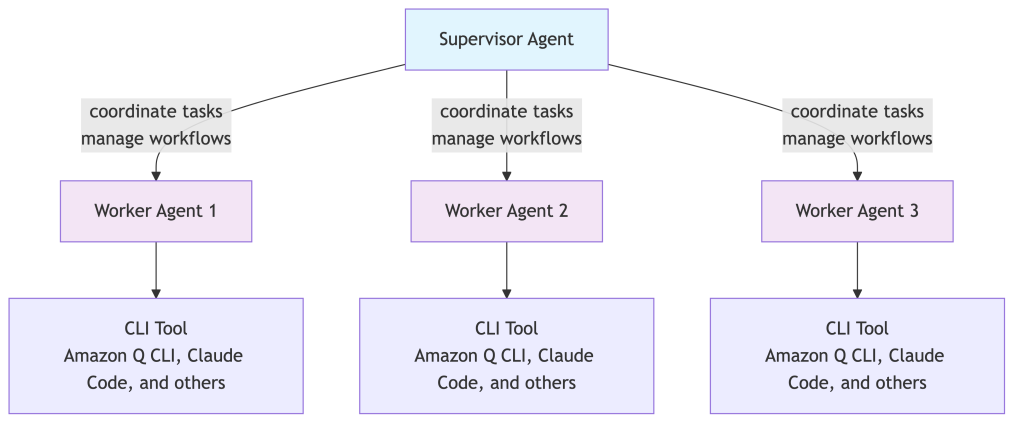 Hierarchical orchestration – CAO’s supervisor agent coordinates workflow management and task delegation to specialized worker agents. The supervisor maintains overall project context while agents focus on their domains of expertise.