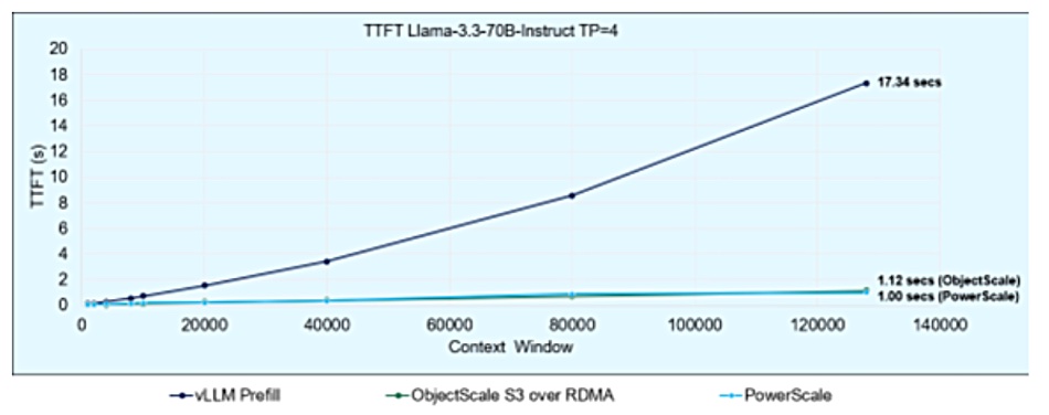 Dell PowerScale and ObjectScale delivered a 1-second TTFT at a full context window of 131K tokens; a 19x improvement over the standard vLLM configuration, which took over 17 seconds at the same context size. At a small context size of 1K tokens, the Dell engines retrieved the KV Cache from storage faster than could be computed on the GPU. More info in a blog.