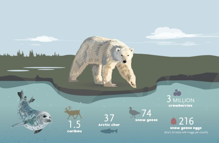 Already, polar bears have already been observed to spend more time on land — and to consume more terrestrial food resources. But the food they are able to eat on land is less rich in digestible energy than the seals they are able to hunt on the ice. This infographic illustrates the alternative terrestrial food sources that would approximately make up for the energy from one ringed seal.