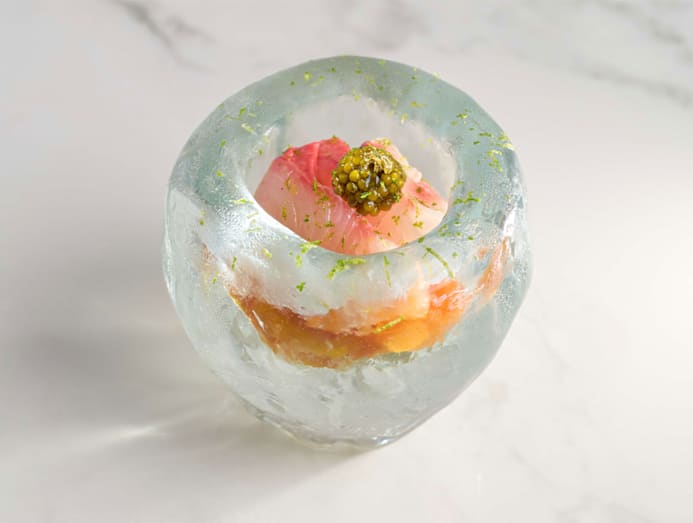 At Peach Blossoms, Caviar, Kampachi, Snow Pear and Yuzu Somen brings Chinese and Southeast Asian flavours into sharp focus. Photo: Peach Blossoms