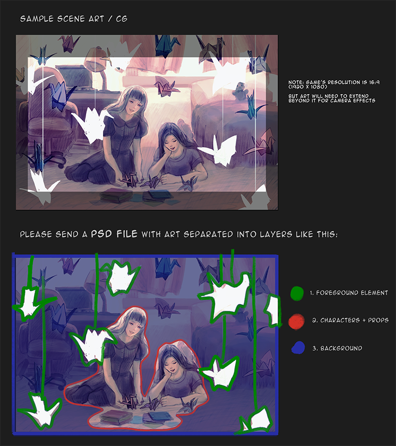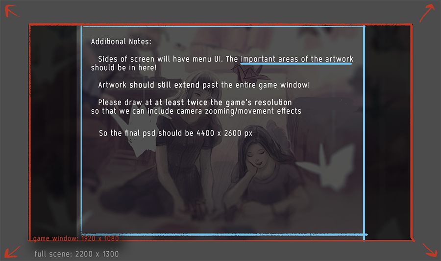 Because we were using parallax effects, the artwork had to be set up a specific way, so I made guidelines for Asri to work with: