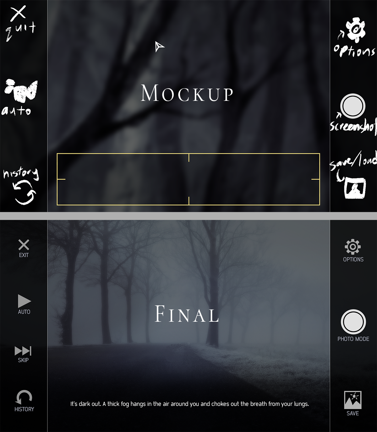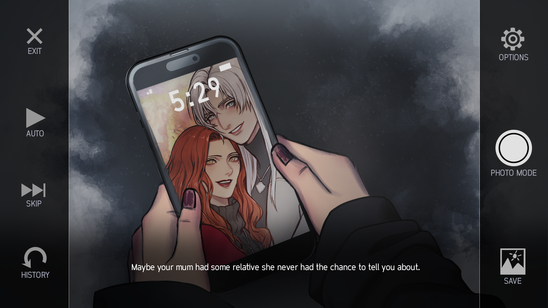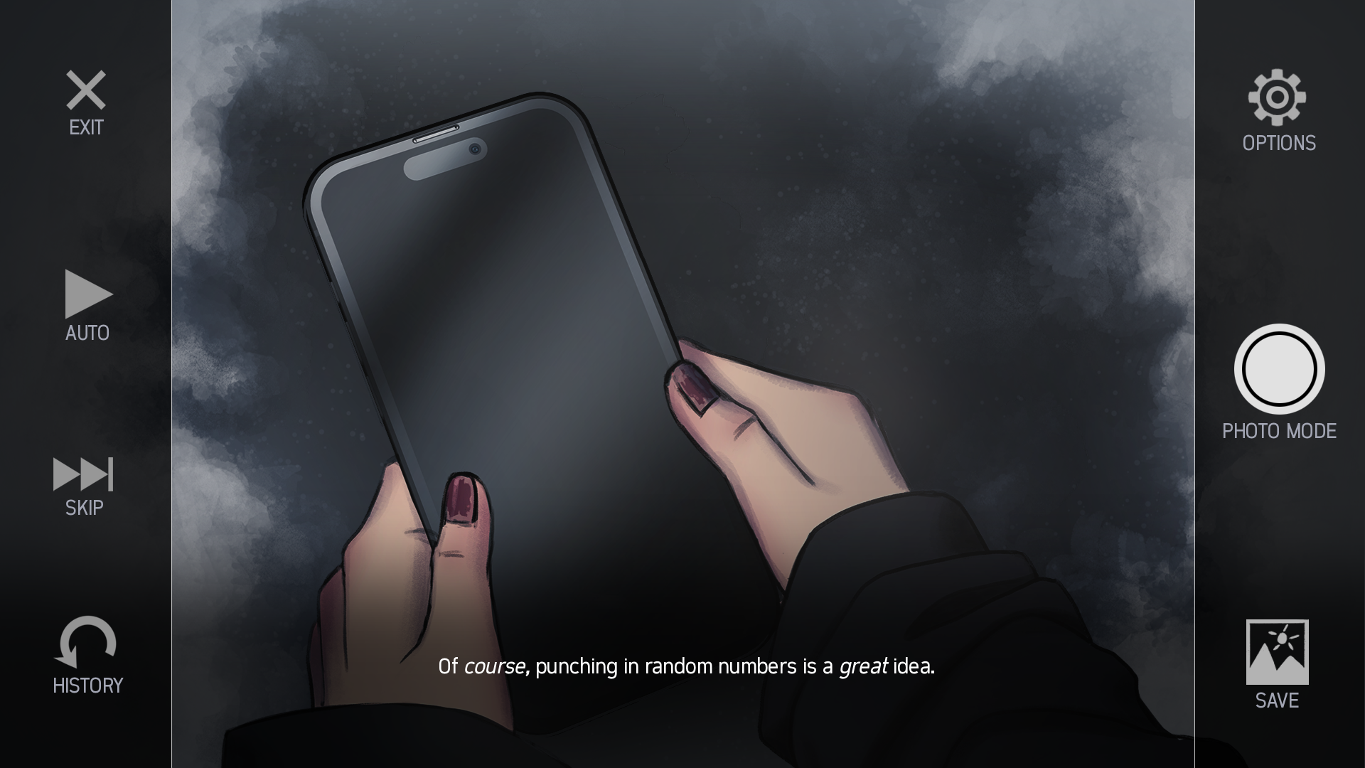 Ren’py already has a built in “hide UI” function (pressing the H key) but I wanted a dedicated button on the menu for it. This fit with the phone camera theme and gave players an easy way to look at Asri’s artwork, which I really wanted to show off.