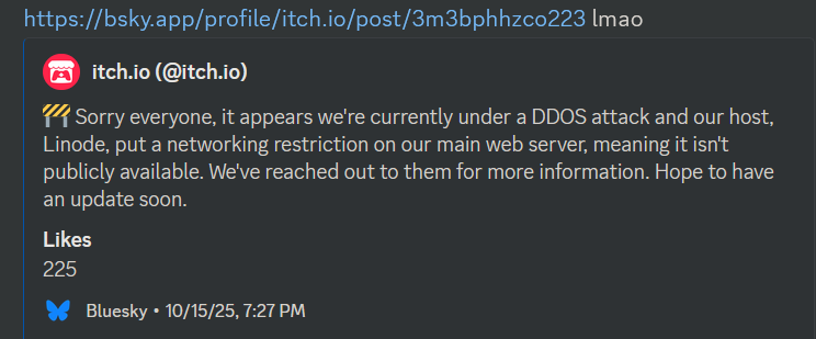 Itch.io experienced some Technical Difficulties around the end of the jam, which was quite fun, but thankfully didn’t affect our submission.
