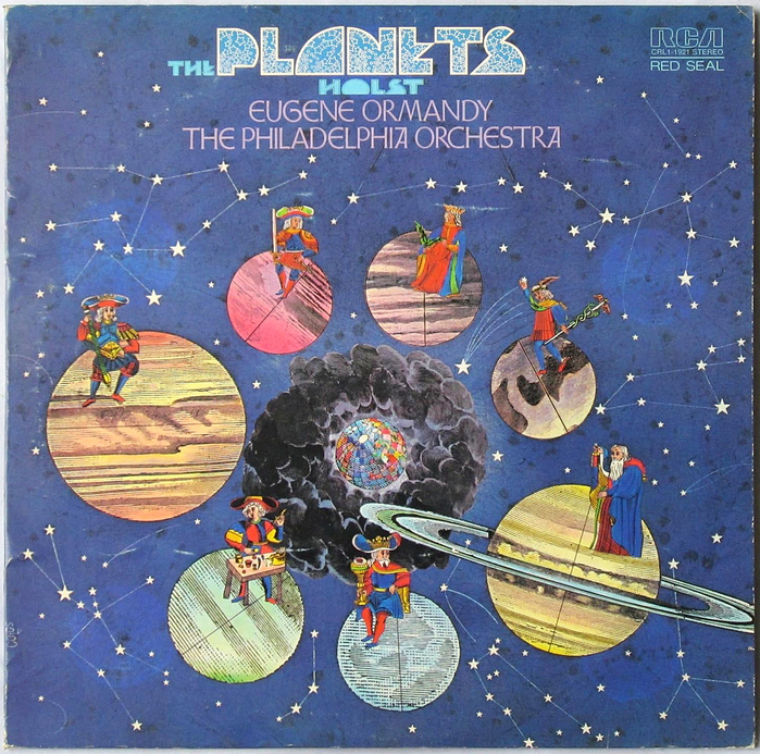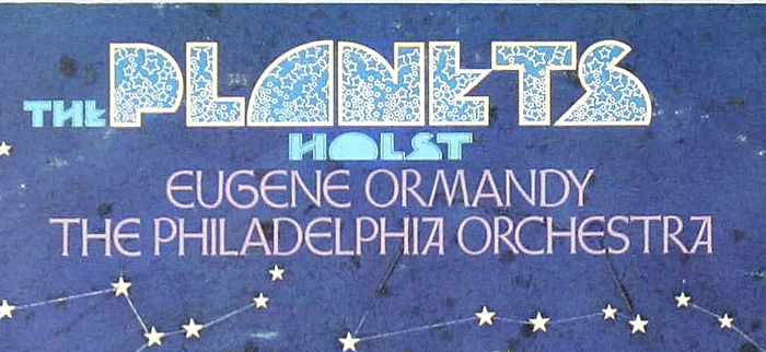 Peter Max’s Riverside Drive including its star-spangled Stars E style, used together with E.R. Weiß’s Weiß-Initialen Serie II, featuring both its forms for A and the round uncialish E, for the album cover to the Philadelphia Orchestra’s recording of The Planets, led by Eugene Ormandy.