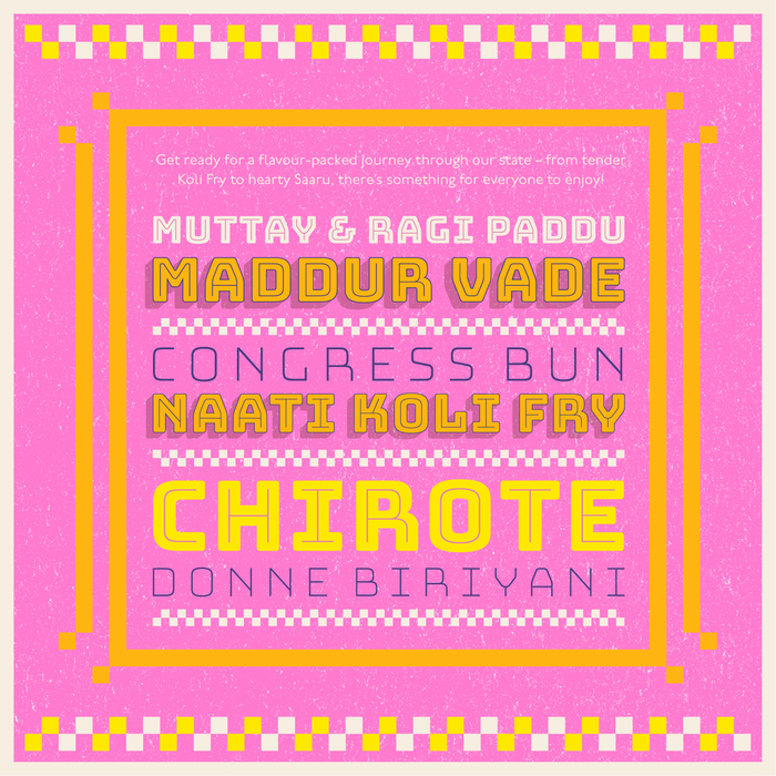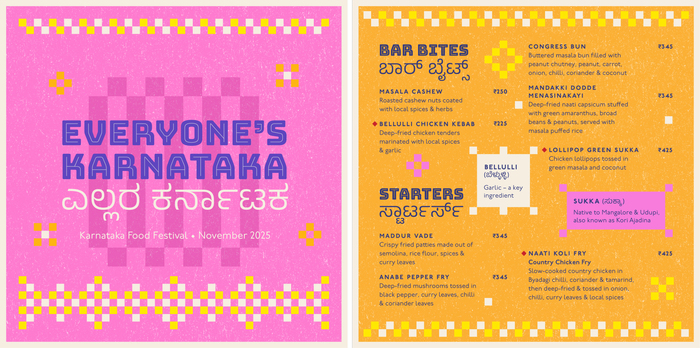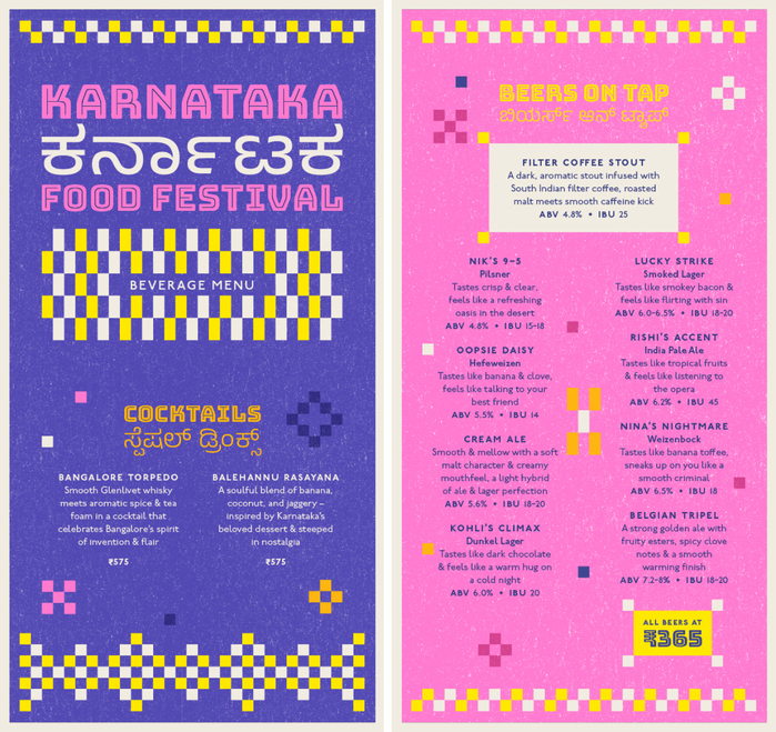Every year, Biergarten Brewery & Kitchen celebrates the Karnataka Food Festival – a tribute to a state that’s a mosaic of accents, kitchens, playlists, and Friday-night pints. This year’s identity draws from the warmth of the Kowdhi quilt of North Karnataka; square patchworks of reused fabrics stitched into rhythmic geometry, paired with colours inspired by vibrant risograph inks and traditional quilts.