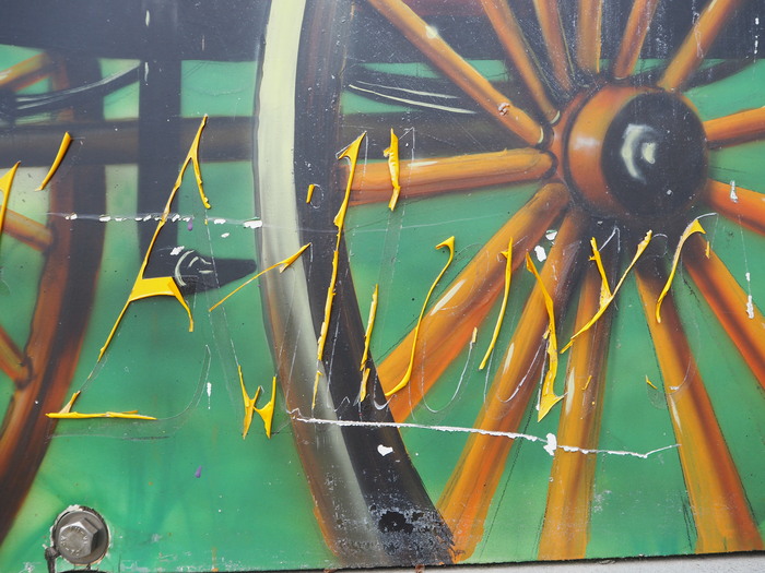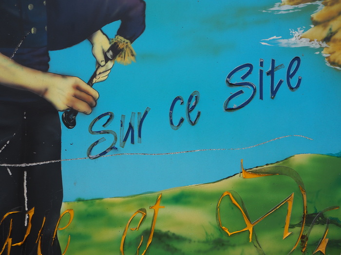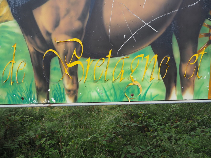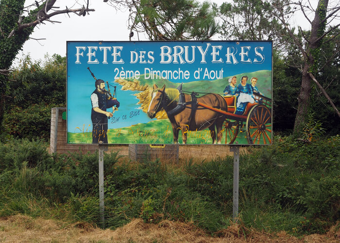 On our way from the parking to the cliffs of Beuzec-Cap-Sizun, Bretagne, we passed workers dismantling a stage from a festival that ended the previous day plus a sign explaining what we had just missed. Fête de Bruyères (“Heather festival”) is a local folk festival with dance and music held every second Sunday in August. The billboard shows a man in folk costume playing bagpipe and women in traditional clothing riding a horse carriage, with the côte sauvage (“wild coast”) as a backdrop. The airbrushed image is partly covered with vinyl lettering, using a different font for each line. It is signed by local sign firm Le Bars Publicité in the bottom left corner, but not dated.