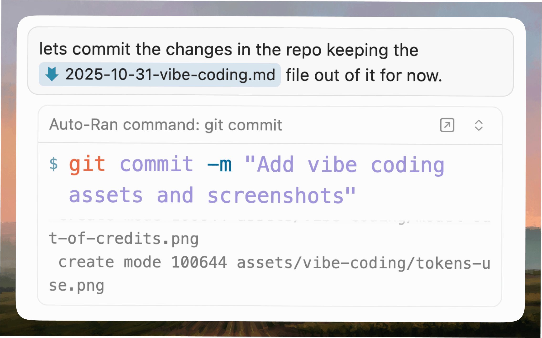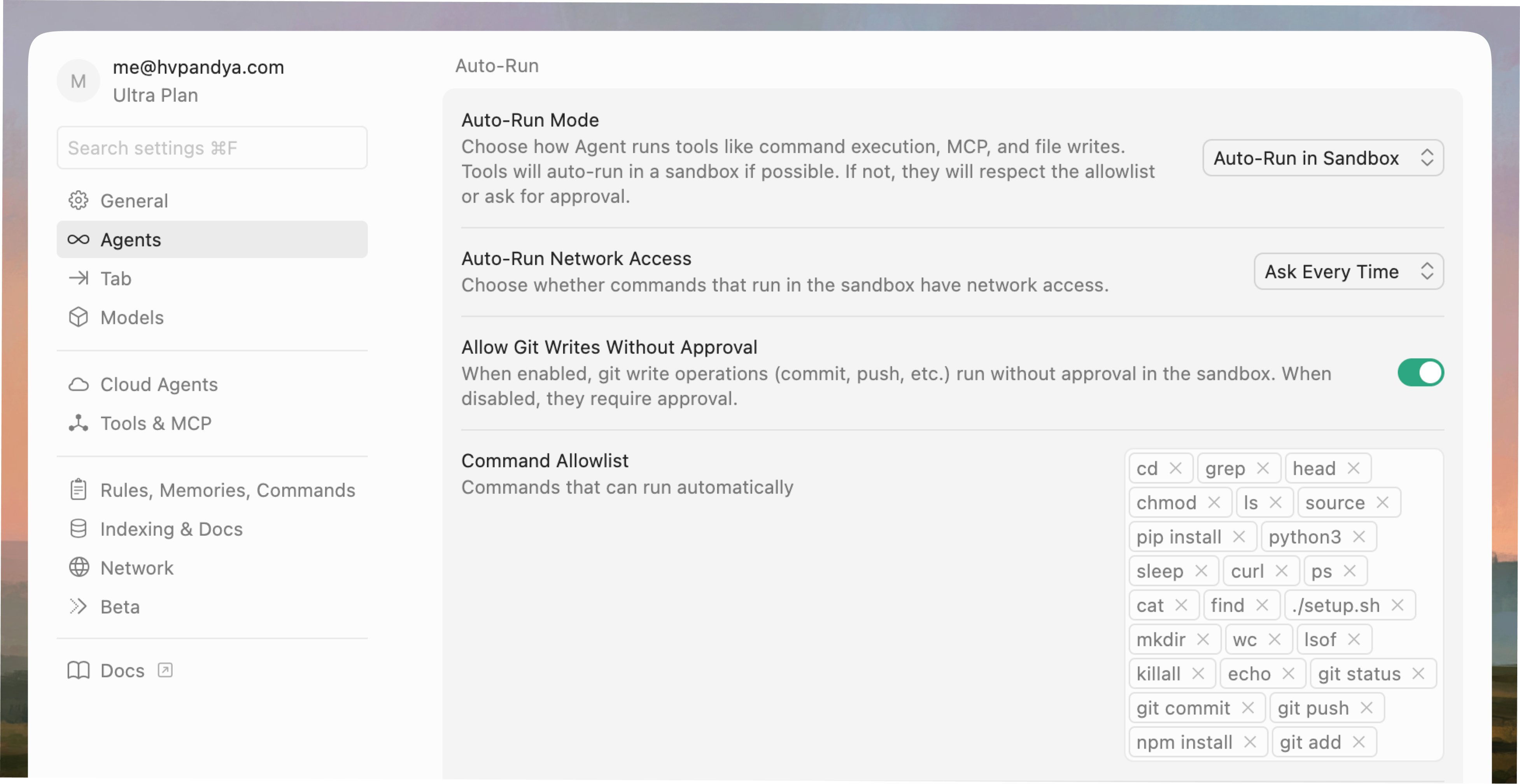 Additionally, Cursor’s Allowlist feature can automate these commands (coming to that in a bit), so you can say “Commit current changes” and it all happens in an instant.