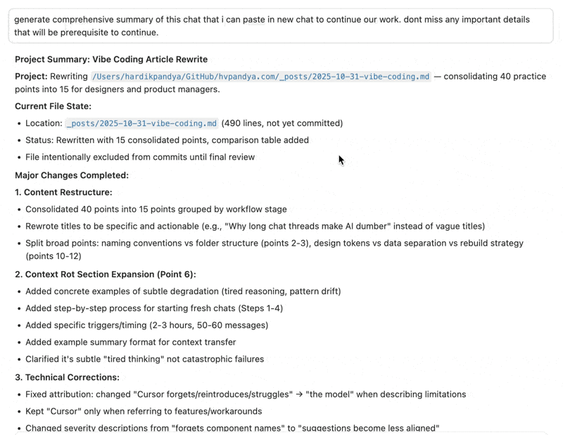 Before closing your current chat, ask Cursor to create a comprehensive summary of your project state, then copy that summary and paste it as the first message in a fresh chat to transfer all essential context cleanly.