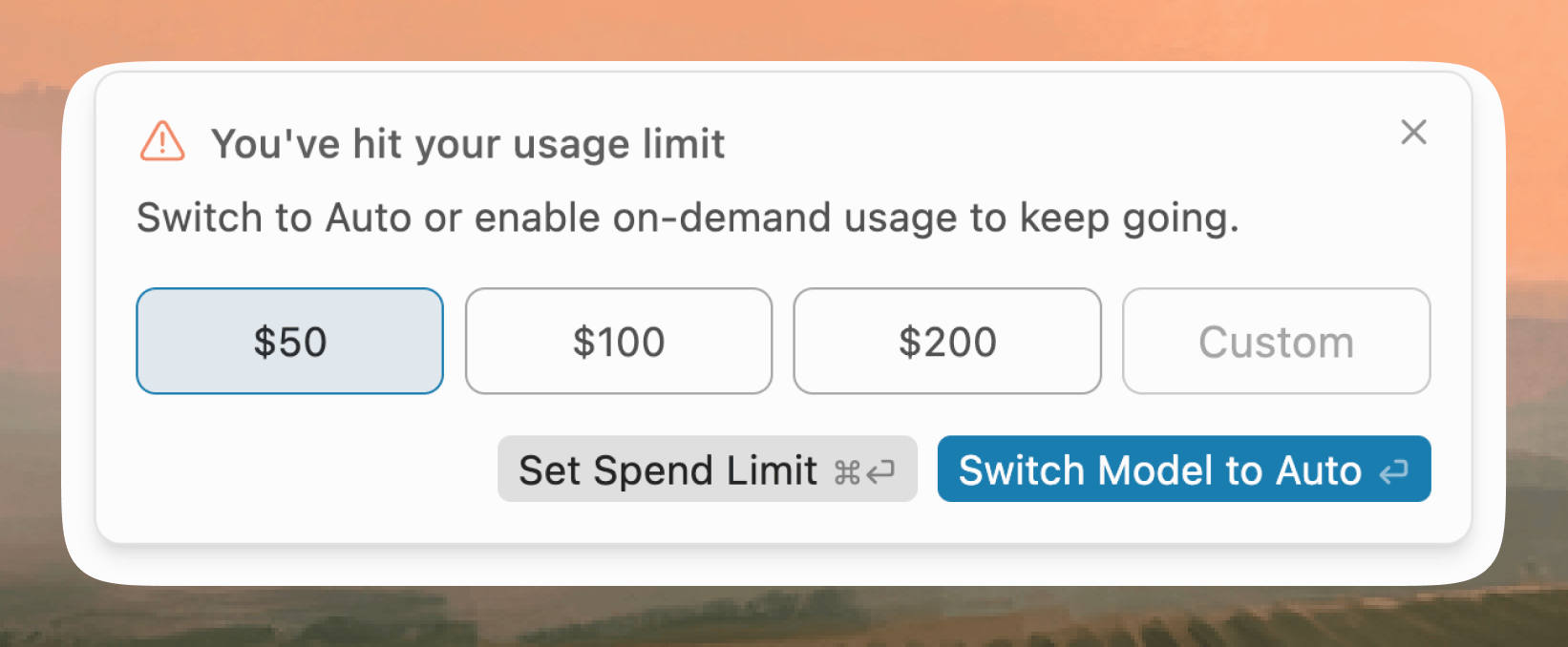 Enable Auto mode as fallback. When credits run out for premium models, Cursor automatically switches to the fallback Auto mode so your workflow never stops. The fallback maintains conversation context, so you can complete your session and switch back when credits refresh. I’ve found the Auto mode to be reasonably powerful and fast.