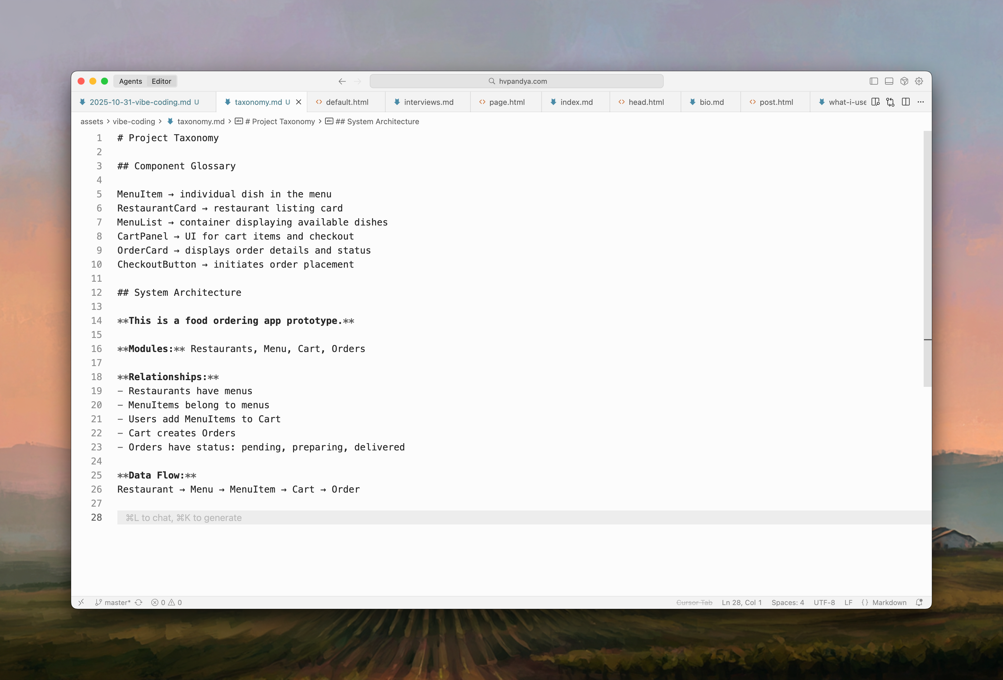 Turn this into a taxonomy.md file with Cursor and it will remember all of it henceforth. Now when you say “add MenuItem to Cart,” it knows exactly what those are and how they connect. Your prompts become shorter, more accurate, deterministic and the AI generates code that actually works together.