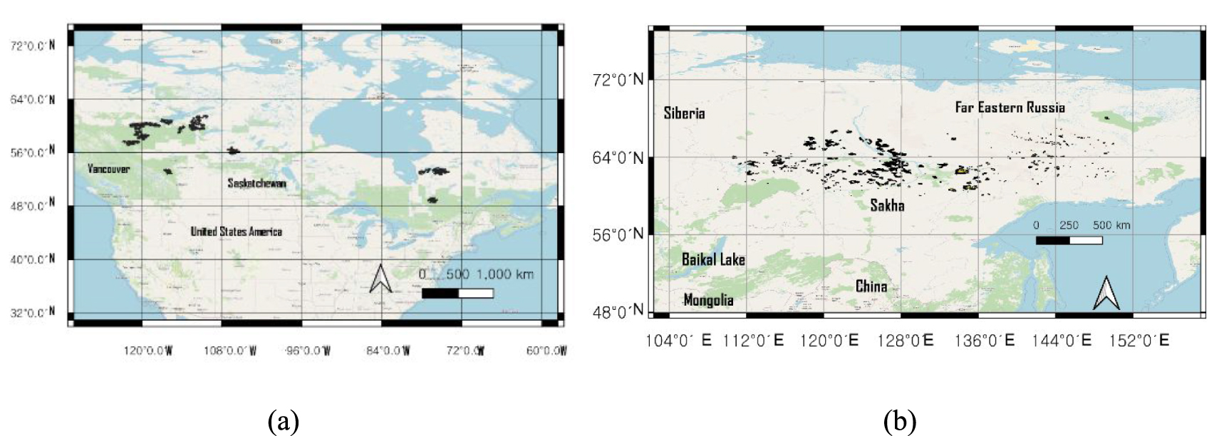 Figure 1. Study domain: (a) Canadian wildfires in 2023 (b) Sakha Republic wildfires in 2021.