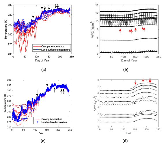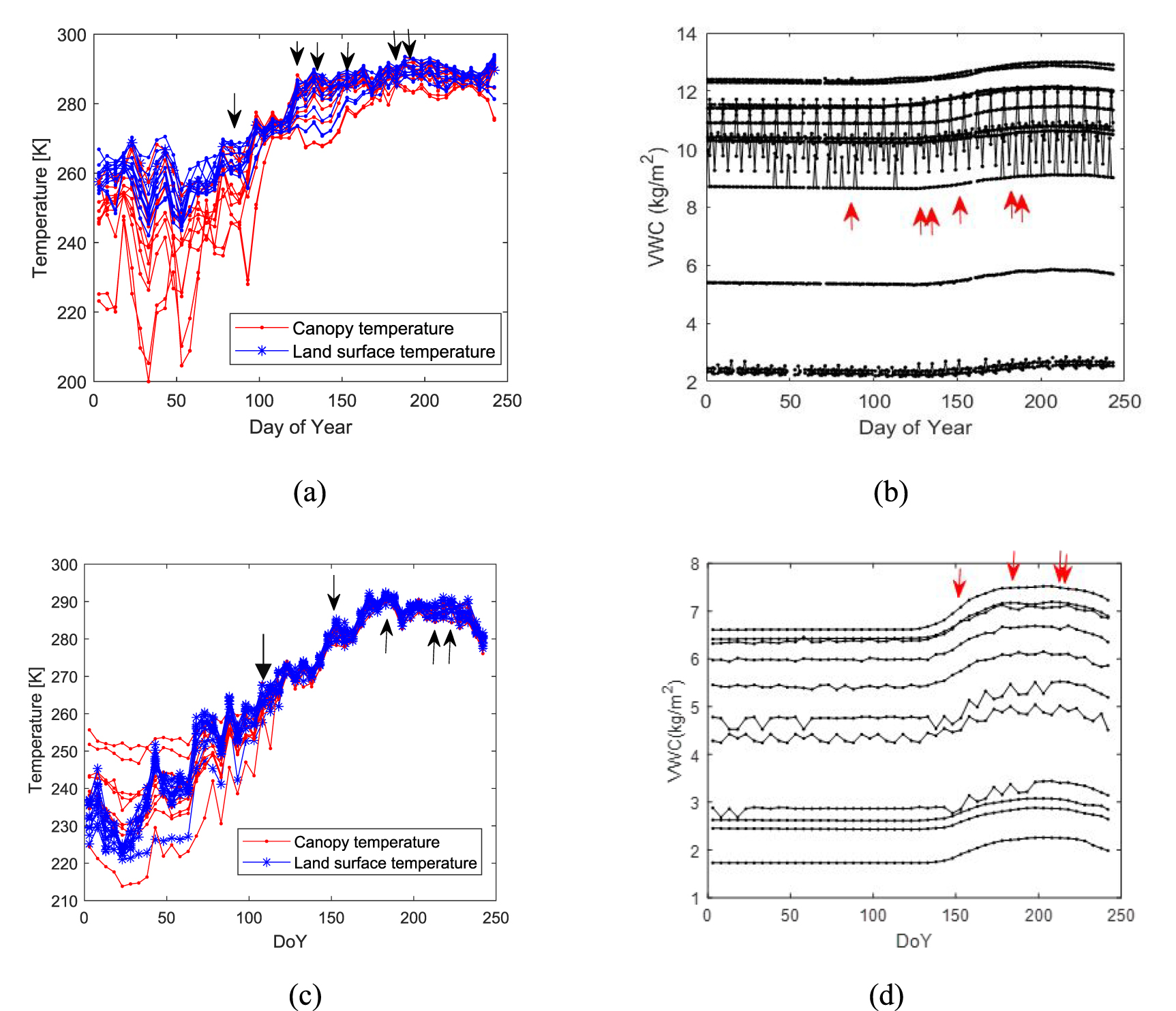 Figure 2. Temporal evolution over various fire burned areas (arrows show ignition dates): (a) spatial average of SMOS canopy and ERA5 land surface temperatures of each burned areas in 2023 Canadian wildfire, (b) spatial average of SMAP vegetation water contents (VWC) for the same burned areas as (a), (c) and (d) the same as (a) and (b) for 2021 Sakha Republic wildfires.