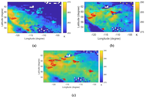 Figure 3. Spatial distribution of 5 d-averaged SMOS canopy fuel temperatures over 2023 Canadian wildfires before following ignition dates (red polygons indicate areas ignited; cyan polygons show areas not ignited yet): (a) DoY 86 (b) DoY 130 (c) DoY 180 figure 3. Spatial distribution of 5 d-averaged SMOS canopy fuel temperatures over 2023 Canadian wildfires before following ignition dates (red polygons indicate areas ignited; cyan polygons show areas not ignited yet): (a) DoY 86 (b) DoY 130 (c) DoY 180.