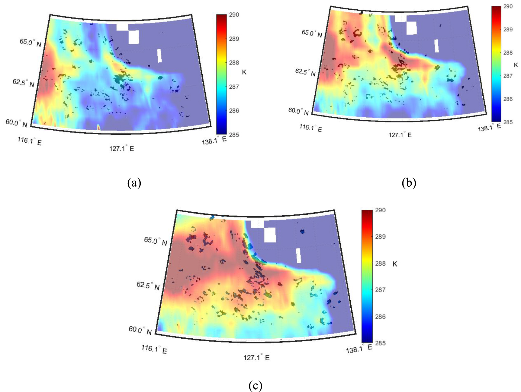 Figure 4. Spatial distribution of 5 d-averaged SMOS fuel temperature over 2021 Sakha wildfires before the following ignition dates (black polygons are fire areas): (a) DoY 214–215 (b) DoY 216–218 (c) DoY 219–223.