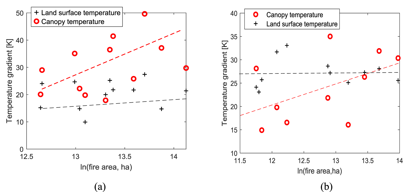 By combining figure 2 with 5 to investigate which temperatures better represent the preheating process (fuel dehydration) in forests that will make them more vulnerable to ignition and fire spread, we suggest that a short-term nonlinear increase in canopy temperatures effectively indicates fuel availability and warns of fire spread ahead of the flames. In other words, a higher antecedent canopy temperature gradient results in greater surface heating and more intense fire spread, leading to destructive megafires, as seen in Canada, due to significant heat absorption at the incipient stage.