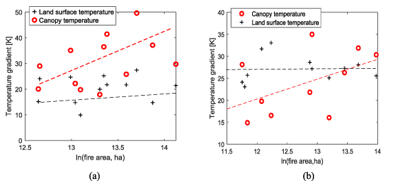 We also found that pre-fire canopy temperatures in forests influence fire spread. Figure 5 shows the relationship between pre-fire temperature increments at incipient stages (e.g. temperature increases measured from the lowest temperature until ignition stages) and burned areas for all ignition dates. Although the correlation with land surface temperatures was weak or absent, we found a positive relationship between pre-fire canopy temperatures and final burned areas. Notably, the antecedent canopy temperature increase in Canadian wildfires (20–53 K) was greater than that in wildfires in the Sakha Republic (15–35 K). This gradient of canopy temperatures aligns well with the fire-burned areas: Canadian wildfires (7998 611 ha, correlation ρ of canopy temperatures Tc = 0.52, ρ of land surface temperatures LST = 0.07) and Sakha wildfires (1,952,417 ha, ρ of Tc = 0.5, ρ of LST = 0.017). Although the correlation with canopy temperature can be shown to some extent, a perfect linearity (e.g. ρ > 0.9) is not expected. The relationship between fuel temperature and fire spread is fundamentally nonlinear, as fires spread radically and abruptly once a threshold is exceeded.