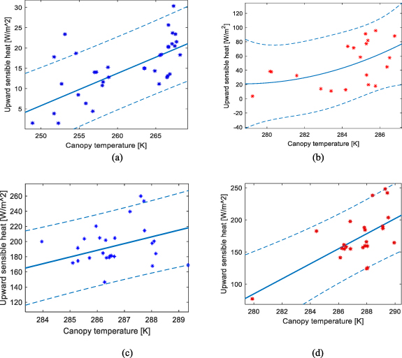 Figure 6. Relationships between pre-fire 7 d-averaged SMOS canopy temperature and ERA5 upwards sensible heat: (a) 2023 Canadian fire areas before the ignition date DoY 86 (ρ = 0.67, P-value= 1 × 10−5) (b) 2023 Canadian fire areas before ignition date DoY 131 (ρ = 0.51, P-value = 0.02), (c) 2021 Sakha fire areas before the ignition date DoY 214 (ρ = 0.56, P-value = 0.0022) (d) 2021 Sakha fire areas before the ignition date DoY 216 (ρ = 0.63, P-value = 9 × 10−4), dash-line: 90% confidence levels.