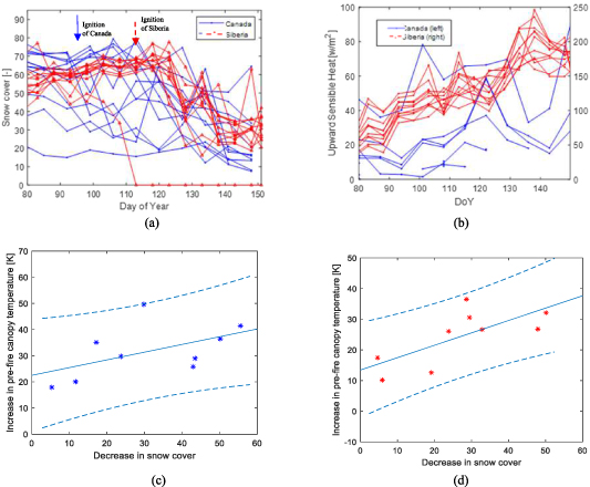 Figure 7. Relationship between pre-fire SMOS canopy temperature, ERA5 sensible heat and MODIS snow cover over various fire burned areas: (a) time-series snow-melt (b) time-series sensible heat (c) an increase in antecedent canopy temperature (DoY 29–98) and subsequent snowmelt (DoY 100–148) for Canadian fire areas (ρ = 0.62, P-value = 0.07) (d) an increase in antecedent canopy temperature (DoY 26–98) and subsequent snowmelt (DoY 116–147) for Sakha fire areas (ρ = 0.73, P-value = 0.02). Dash-line: 90% confidence levels.
