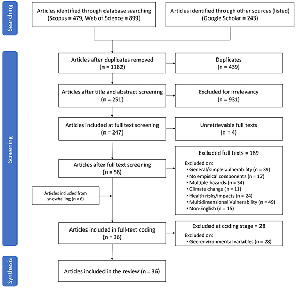The systematic study selection process, adhering to PRISMA guidelines, is summarized in figure 1. A total of 479 records were retrieved from Scopus, 899 from Web of Science, and 243 from Google Scholar, resulting in 1621 records in total. After removing duplicates (n = 439) in EndNote, 1182 articles were advanced for title and abstract screening. A total of 931 articles were excluded at this stage due to irrelevance based on the pre-defined eligibility criteria (as detailed in section 2.3), which left 251 articles for full-text screening. During the full-text screening, 4 articles proved inaccessible, and 189 articles did not meet the inclusion criteria. The rigorous application of our eligibility criteria, particularly those regarding the specific focus on social vulnerability in flood contexts and the exclusion of integrated or overly broad vulnerability assessments, led to their exclusion. This left 58 articles for initial synthesis.