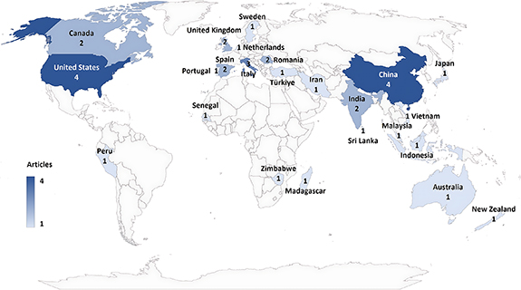 The geographical distribution of the studies is global, with publications appearing across various regions (figure 2). However, the overall number of studies remains low, with a relatively even spread across locations.