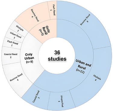 Most studies (n = 22) examined contexts encompassing both urban and rural areas (figure 3). Within this group, analyzes of riverine floods were present in 8 studies, multiple flood types in 8 studies, coastal floods in 3 studies, and 3 studies did not specify the flood type. Separately, among studies exclusively focusing on urban settings (n = 9), 4 studies focused on riverine floods, 2 studies on coastal floods, and one study each on urban floods, flash floods, and multiple flood types. For studies exclusively addressing rural settings (n = 5), riverine floods were the dominant focus (4 studies), with one study examining flash floods.