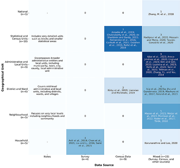 Ten studies focused on statistical and census units, while 9 studies analyzed data at broader administrative and local levels (e.g. municipalities, towns, cities, counties). Additionally, 10 studies had higher spatial resolutions, comprising neighborhood-level (n = 5) and household-level (n = 5), a low number considering they are crucial for understanding localized, individual and family-specific vulnerabilities. Figure 4 presents the relationship between the geographic units of data collection and analysis and the sources of data used in the reviewed studies. There is a notable distinction between studies that rely on surveys and those that use census data or a combination of sources. Most studies employed a mix of census data and secondary sources. The depth provided by household-level surveys seems underutilized, with only 5 studies focusing on the household level and 4 utilizing surveys exclusively. Surveys are valuable for obtaining detailed, context-specific information that complements quantitative data, underscoring a significant gap in capturing comprehensive individual and household level insights.