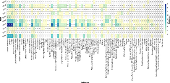 A closer look at the temporal distribution of 78 social vulnerability indicators across 36 reviewed studies (see figure 5) suggests a gradual diversification in both the number and diversity of indicators used over time, particularly from 2018 onward. In the earlier years (2014–2016), the literature predominantly relied on a narrower subset of demographic and socioeconomic indicators. Over the decade, there is a modest but notable shift toward multi-dimensional approaches that recognize the intersectional and systemic nature of vulnerability. Frequently utilized indicators throughout the period include ‘Female,’ ‘Dependent Persons,’ ‘Employment,’ ‘Education,’ ‘Household Size,’ ‘Income and Economic Status,’ ‘Housing Tenure,’ ‘Elderly,’ and ‘Children.’