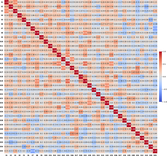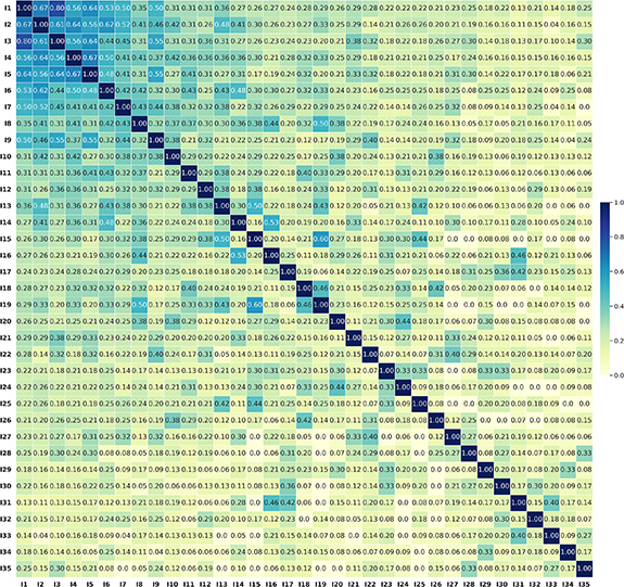 Figure 7. Pearson correlation heatmap (top 35 indicators mentioned in ⩾6 studies).