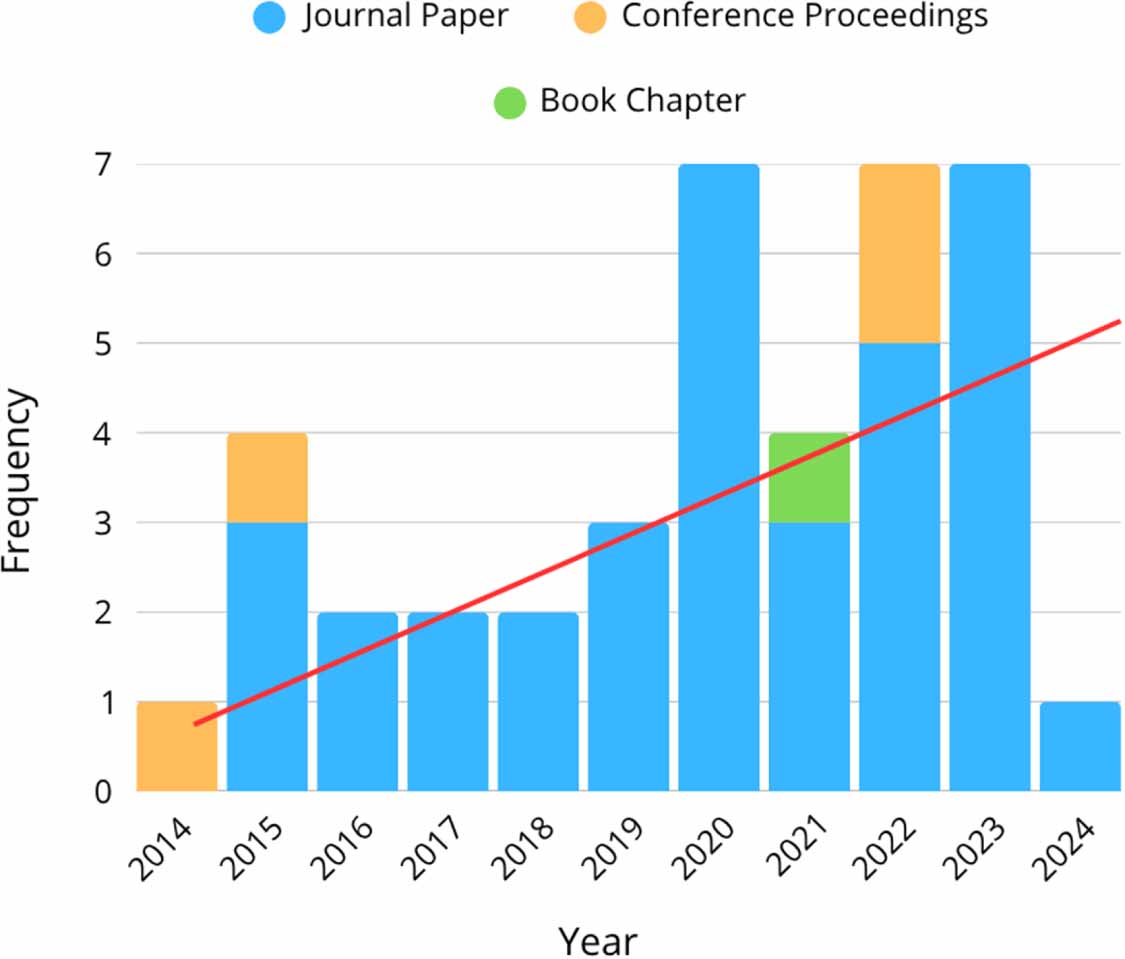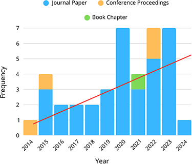 Due to the time-related exclusion criterion established, the earliest papers retrieved date back to 2014. The number of publications remained relatively stable between 2015 and 2019, with one to four publications per year. This number increased in 2020, with the publication of seven articles, and the tendency stays stable until 2023. The data for 2024 is considered incomplete. For additional information, refer to figure 1.
