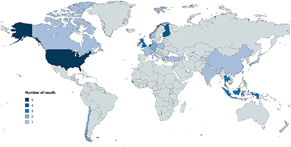 The primary countries where the research was conducted are the United States (12.5%) and Finland, with 10%. The remaining interventions with more than one result are Indonesia, the Netherlands, the United Kingdom and Thailand (7.5% each), and Chile, Germany, and Taiwan (5% each). Based on the author team’s affiliations, the results are similar, highlighting the presence of the United States, Finland, and the United Kingdom. If the paper did not specify the location of the physical intervention, it was inferred based on the institutional origin of the researchers involved. On the other hand, a few research papers indicated an online intervention (5%). For additional information, refer to figure 2.