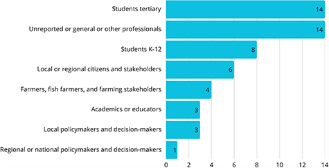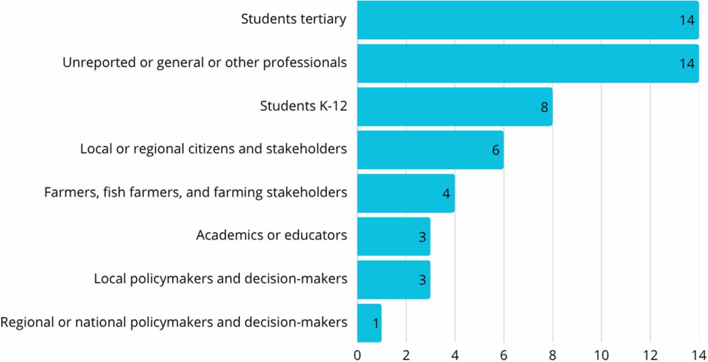 Most gamified experiences were directed towards students, particularly those in higher education. A total of 20% of the participants were K-12 students, encompassing both primary and secondary education, with an age range of 5–18 years; in contrast, tertiary education represents 35%. Academics, professionals, and stakeholders constituted 42.5% of the sample; meanwhile, research samples whose occupations were either unreported or belonged to other professional sectors accounted for 35%. Figure 3 shows more details about the professional background of the participants. The total number exceeds the 40 studies analyzed, as several of them encompassed more than one type of occupation.