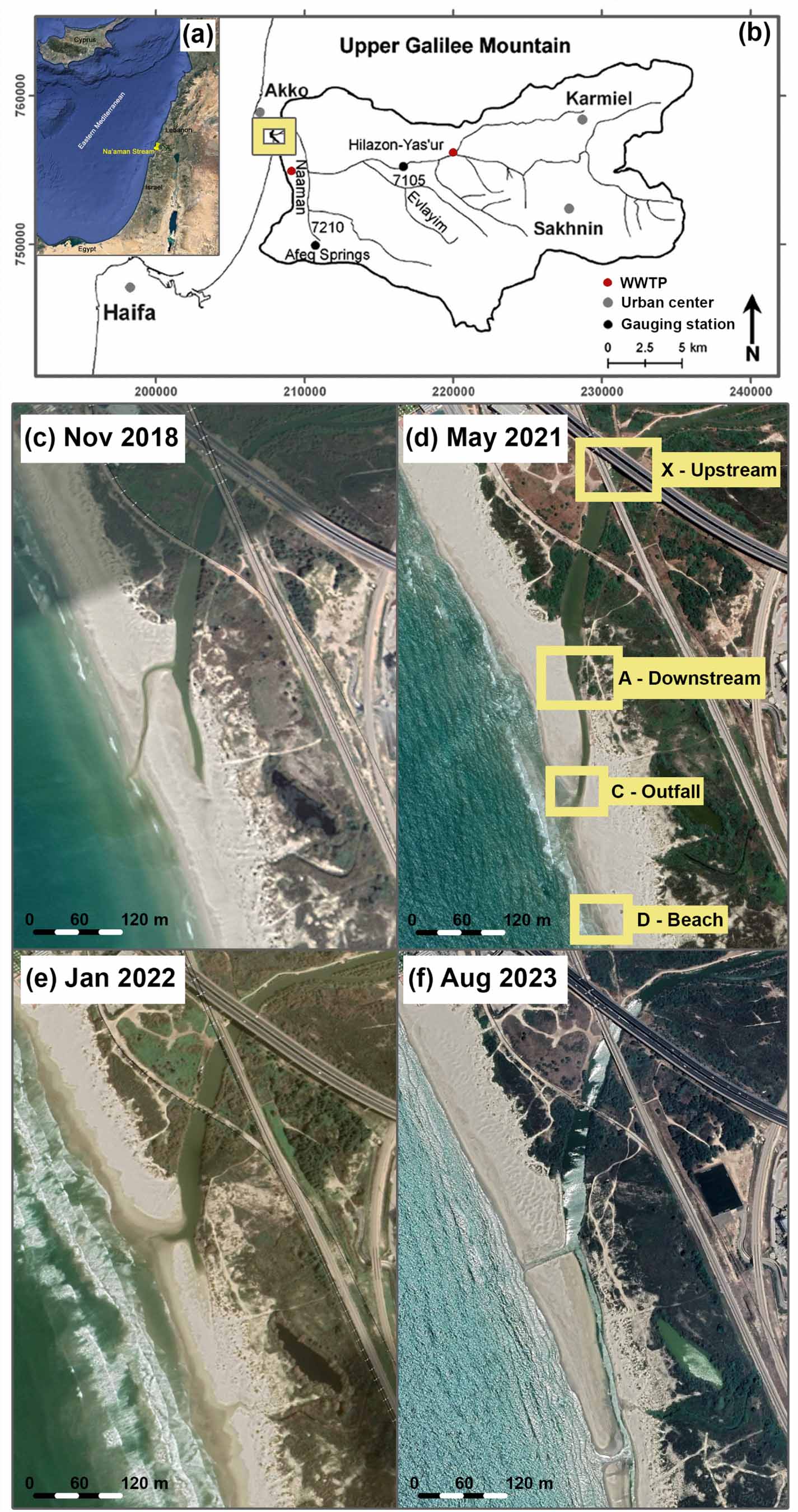 Figure 1. The Na’aman study area in northern Israel (a), and the Na’aman watershed (b). Modified after Lichter et al (2009) and indicating locations of wastewater treatment plants (WWTP), urban centers and stream flow gauging stations. Changes in the mouth of the Na’aman stream are illustrated in aerial photographs (panels (c)–(f)), and the sampling site locations are indicated in panel (d). (b) Adapted with permissions from Lichter et al (2009). (a), (c) and (d) Maps data: Google, ©2025 Maxar Technologies.