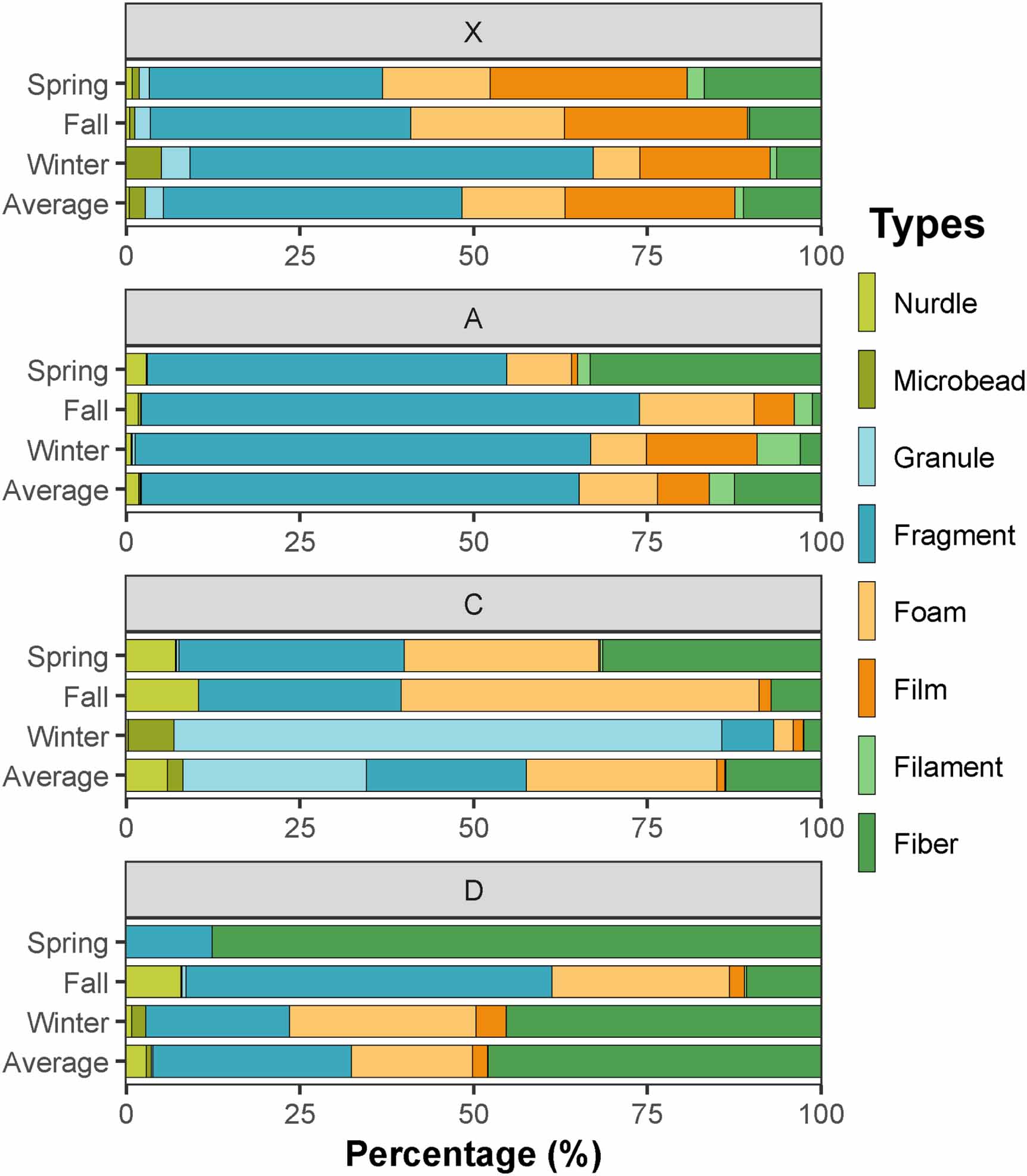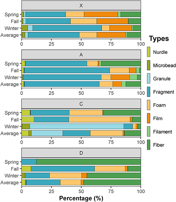 There were significant differences in the proportions of MP types among sites and seasons (PERMANOVA, R2 = 0.66, F = 2.34, p < 0.05). The four most abundant MP types were fragments (62%), followed by foam (12%), film (10%), and granules (7%; figure 2). Several types of MPs were found in some seasons and not in others (figure 2), and in only a few of the sites along the river. Fibers were abundant at all spring sites but less prevalent in other seasons, except at the beach site (D). Likewise, granules were a minor component, and evident only at site X, in all seasons, but were the dominant MP type in winter at site C. Foam and film were present at practically all sites in the three seasons, but these MP types were clearly absent at site D in the spring.