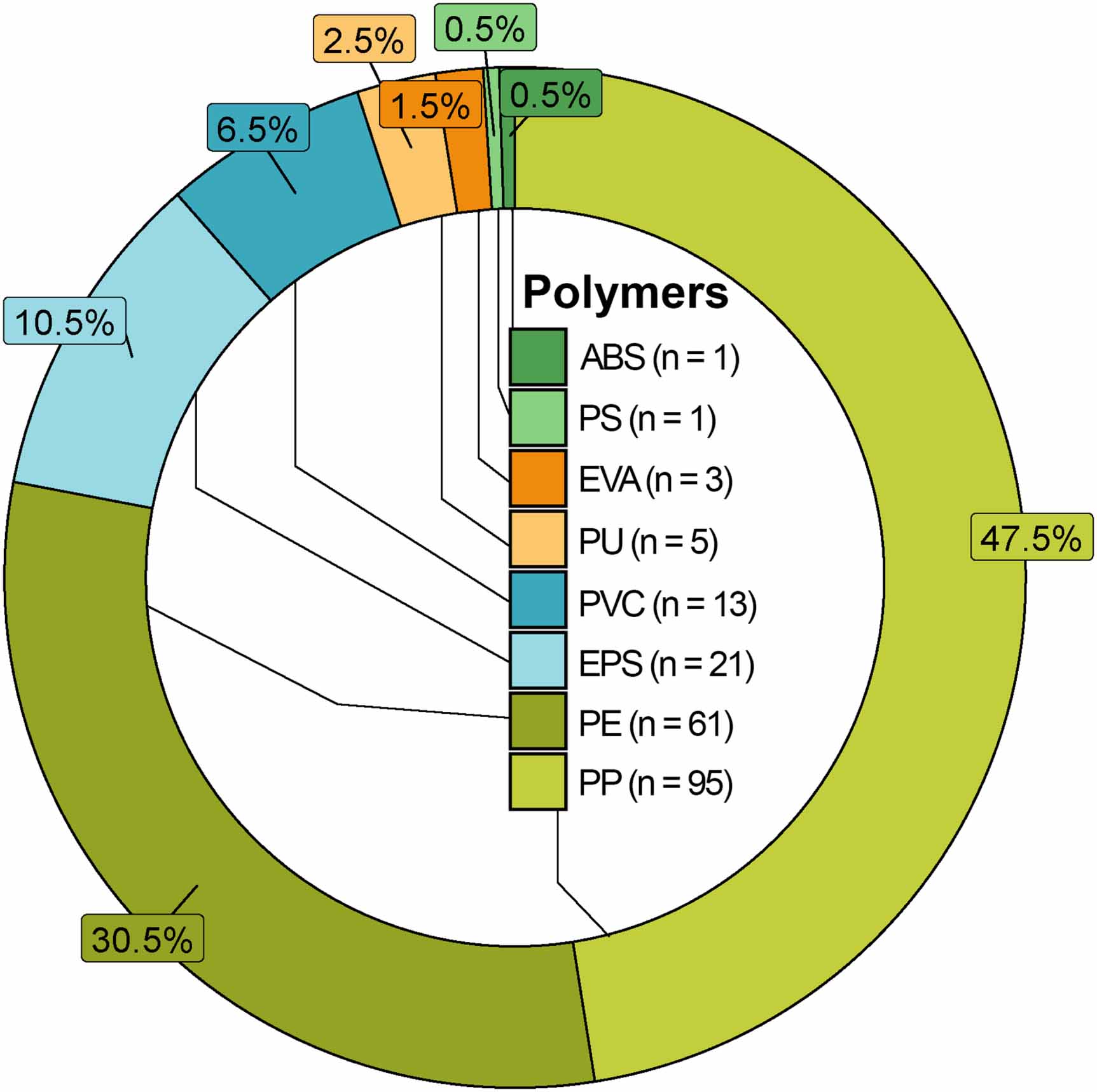 Figure 3. The polymers identified among the MP particles examined. Note: ABS = acrylonitrile butadiene styrene, PS = polystyrene, EVA = ethylene-vinyl acetate, PU = polyurethane, PVC = polyvinyl chloride, EPS = expanded polystyrene, PE = polyethylene, and PP = polypropylene.