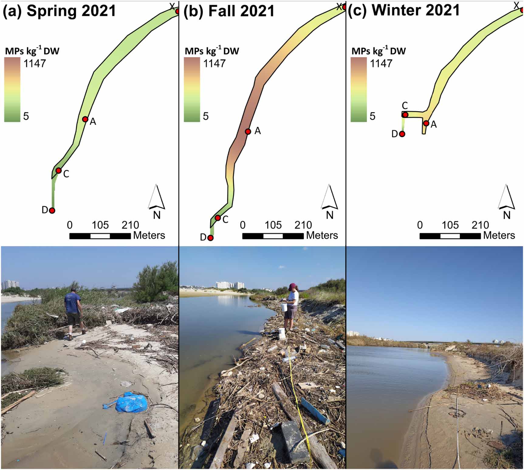 Figure 4. The spatial distribution of empirical MP abundance along the Na’aman stream for spring (a), fall (b) and winter (c), with in situ macro-debris levels depicted in photographs below each corresponding sampling period at site A.