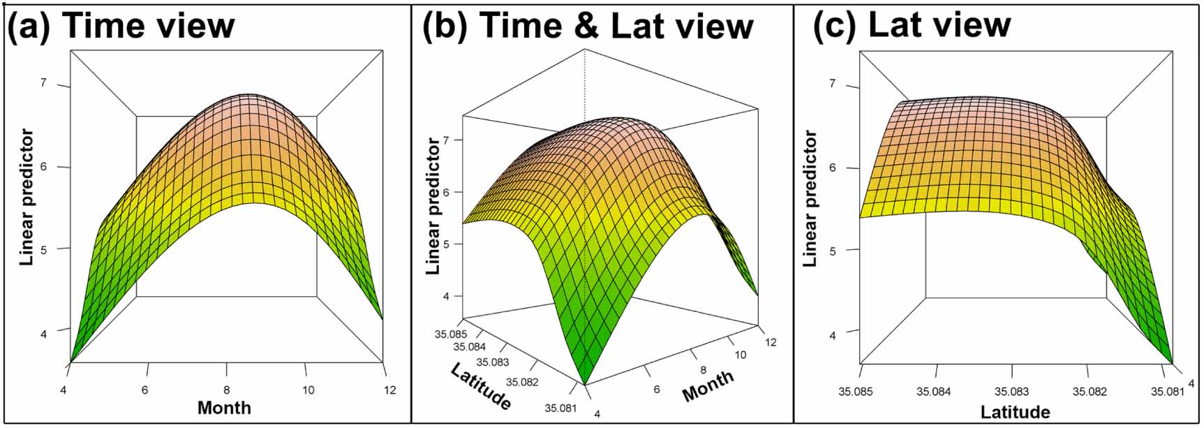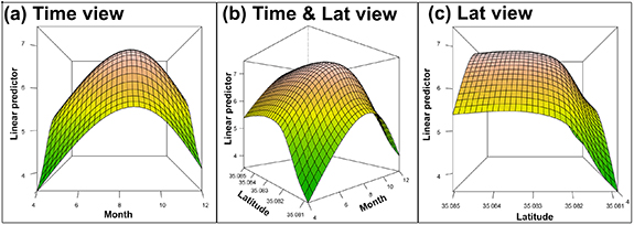 Figure 5. The 3D visualization of the smooth terms of the GAMM against the linear predictor (at log-link scale) shown at different angles (a)–(c). Note: for visualization purposes, only latitude is depicted, reflecting the predominantly latitudinal orientation of the Na’aman stream.