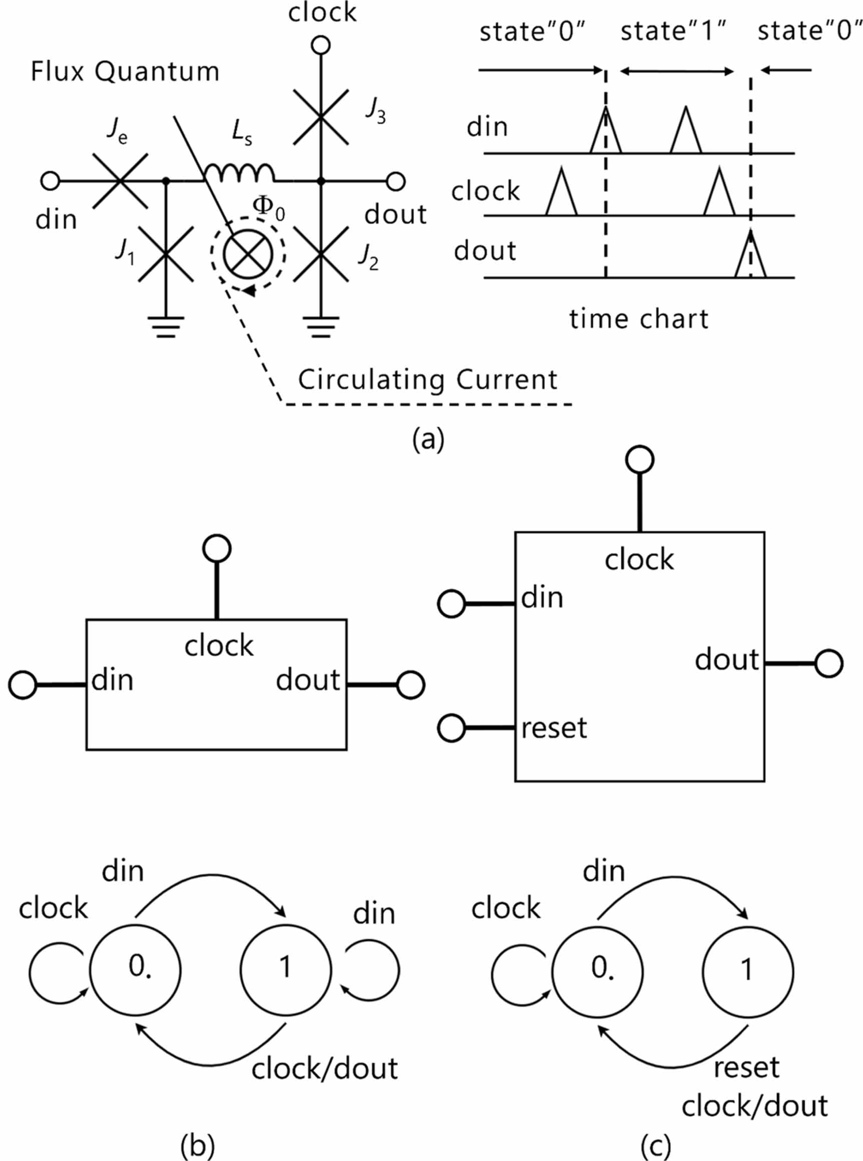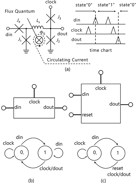 , where h is the Planck constant and e is the electron charge) is stored in the circuit, and the state where a flux quantum is stored, respectively. A Josephson junction is a circuit element that switches and propagates a magnetic flux quantum when the current flowing through it exceeds the critical current. An SFQ input from the ‘din’ port in figure 1(a) induces the switching of Josephson junction J1, and the input magnetic flux quantum is stored in the superconducting loop composed of J1, Ls, and J2. This corresponds to a transition from the ‘0’ state to the ‘1’ state. The stored magnetic flux quantum induces a circulating current, which causes a current to flow in J2, making J2 easier to switch. When a ‘clock’ signal is input in ‘1’ state, J2 switches and the stored magnetic flux quantum is output to the ‘dout’ port. At this time, the DFF is initialized to the ‘0’ state. When the DFFE is in the ‘0’ state, the input ‘clock’ signal is canceled by the switching of J3. The input din signal is canceled by the switching of Je when the DFFE is in the ‘1’ sate. By adjusting the circuit structure and device parameters in this way, various SFQ logic gates can be realized [16].