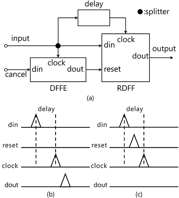 Figure 2. (a) Block diagram of the proposed neuron circuit, and RDFF’s timing diagram (b) without cancel input and (c) with cancel input.