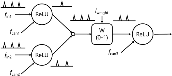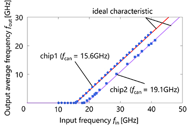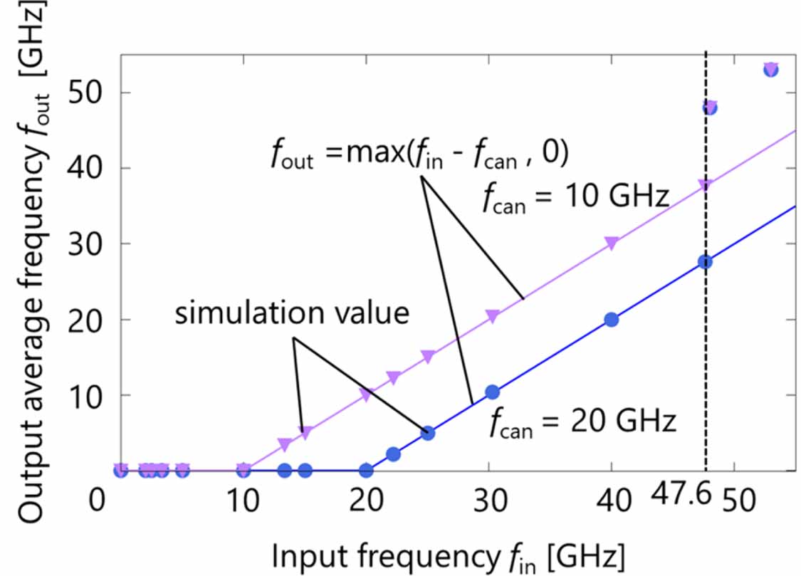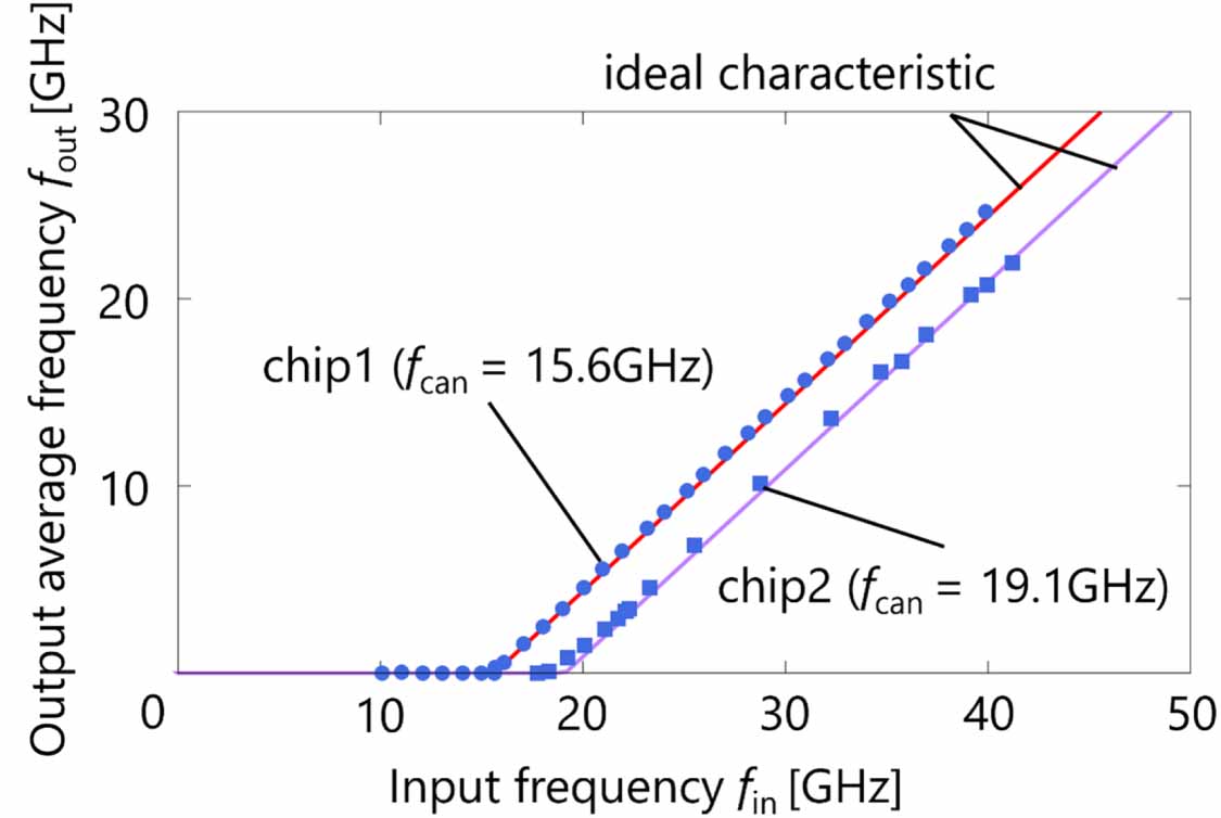 Figure 8 shows the measured output frequency dependence on the input frequency, derived from the high-speed test. We obtained these results from two different chips. In this test, the bias voltage supplied to CGcan was 2.5 mV, which is the standard bias voltage of our design. The measured oscillating frequencies of the CGcan (fcan) for chip1 and 2 were 15.6 GHz and 19.1 GHz for chip 1 and 2, respectively. According to the test element group measurement results, chip1 had manufacturing errors of approximately +13% in critical current of the Josephson junction and −17.0% in resistance value compared to the designed values. Chip2 had manufacturing errors of approximately +9.8% in critical current value and −18.0% in resistance value. The difference in the *f–*can between the two chips can be attributed to the difference in these parameters. However, both chips exhibit ideal input–output characteristics, which agree with the ReLU function. The experimentally obtained maximum operating frequencies for the two chips were 40.5 GHz and 41.2 GHz, respectively. This experimental maximum operating frequency is constrained by the upper limit of the CG oscillation frequency. The neuron circuit itself, however, can operate at higher frequencies, theoretically up to 47.6 GHz, as discussed in section 2.