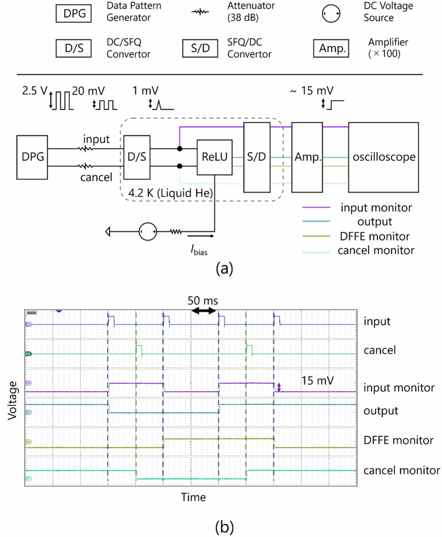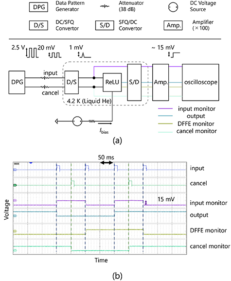 Figure 5. (a) Block diagram of the setup for the low-speed function test. (b) The low-speed function test result of the neuron circuit. The output from the neuron circuit was measured via SFQ/DC converters [16], voltage level transition corresponds to SFQ signal outputs.