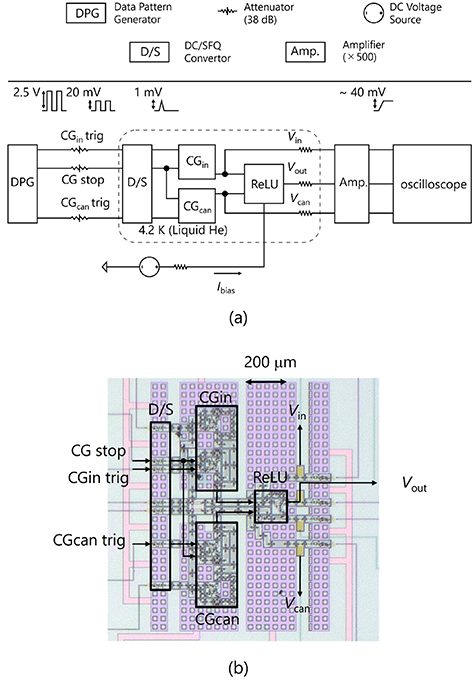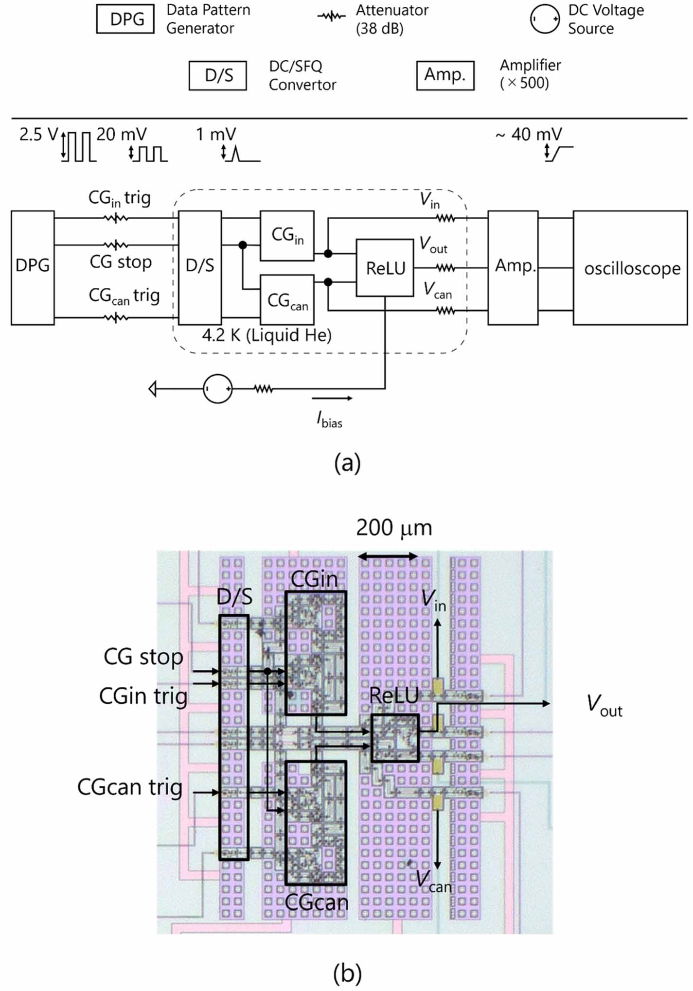 Figure 6(a) shows a block diagram of the high-speed test circuit, which comprises the neuron circuit (ReLU) and ring-oscillator-type clock generators (CGs) [16], and figure 6(b) displays a microphotograph of the fabricated test circuit. Continuous SFQ signals are produced by the CGs (CGin and CGcan) at frequencies ranging from approximately 10 GHz to 40 GHz. Each CG begins pulse generation upon receiving a trigger signal (CGin trig, CGcan trig) and stops operation when a corresponding stop signal (CG stop) is received. The test circuit, encompassing the CGs, signal wiring circuits, and signal interface circuit, integrates 462 Josephson junctions.