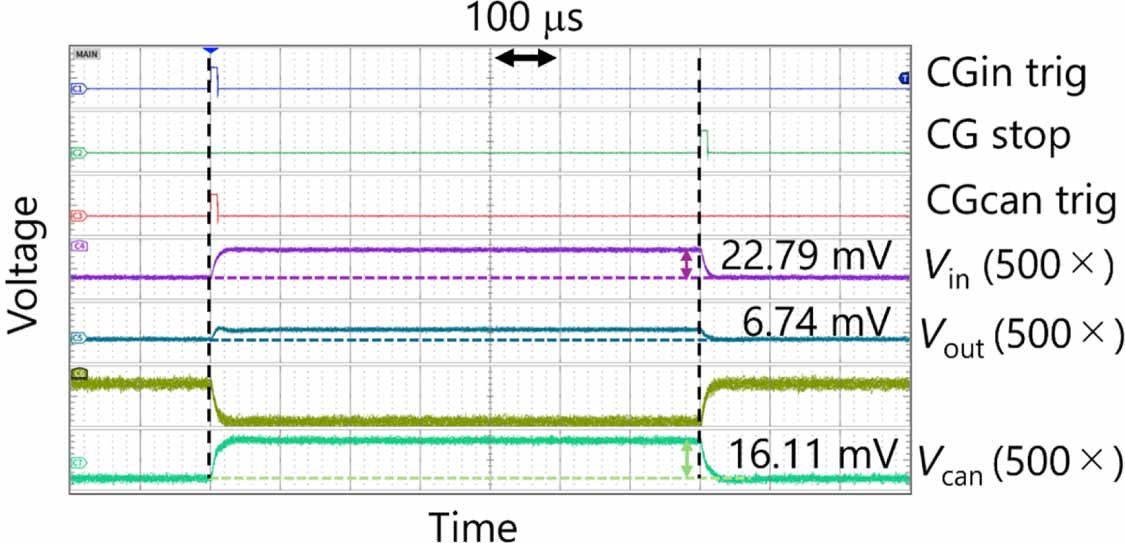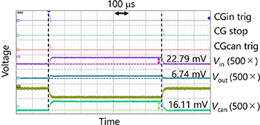 Figure 7 presents an example of the oscilloscope view obtained during high-speed measurement. Finite voltages (Vin, Vcan, and Vout) were observed only while the CG was operational. As the acquired voltage contained noise, the average voltage value during CG operation was utilized as the measurement. In this measurement, fin, fcan, and fout were 22.0 GHz, 16.1 GHz, and 6.5 GHz, respectively. The measured fout approximately agrees with the ideal output frequency (fin–fcan). We attribute the 0.1 mV error to measurement inaccuracies caused by noise and deviations from the nominal amplification rate of the operational amplifier because superconductive circuits can generate voltages with the same level of accuracy as voltage standards [35].