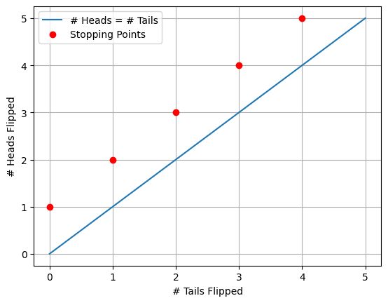 If we wish to improve on this strategy we need to consider a new approach. What if we consider stopping at the first time that we see we have flipped heads more often than tails?