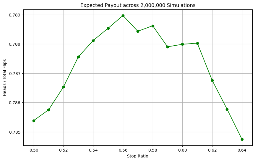 Through large-scale Monte Carlo simulations (2 million runs), we refined this approach by testing various static stopping thresholds. The simulations confirmed our analytical result and identified a more optimal policy: stopping only when the ratio of heads to total flips exceeds 0.56. This optimized policy increases the expected payout to approximately 0.789, boosting the expected profit to 3.9 cents per game and achieving a return on investment of over 5%.